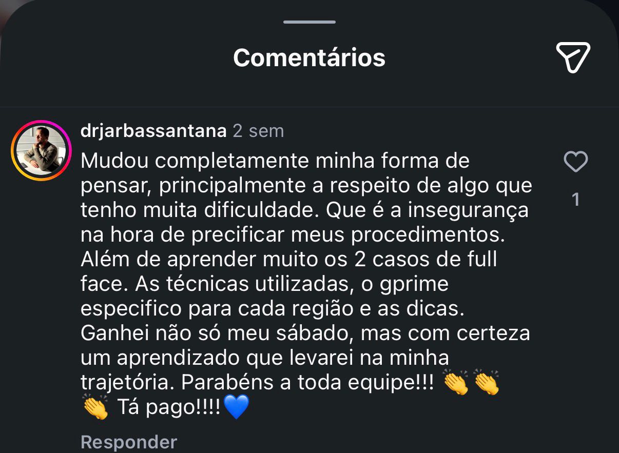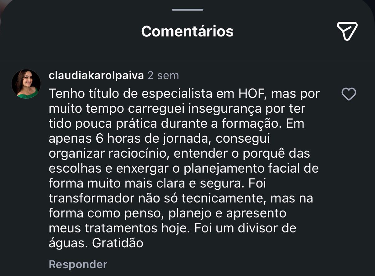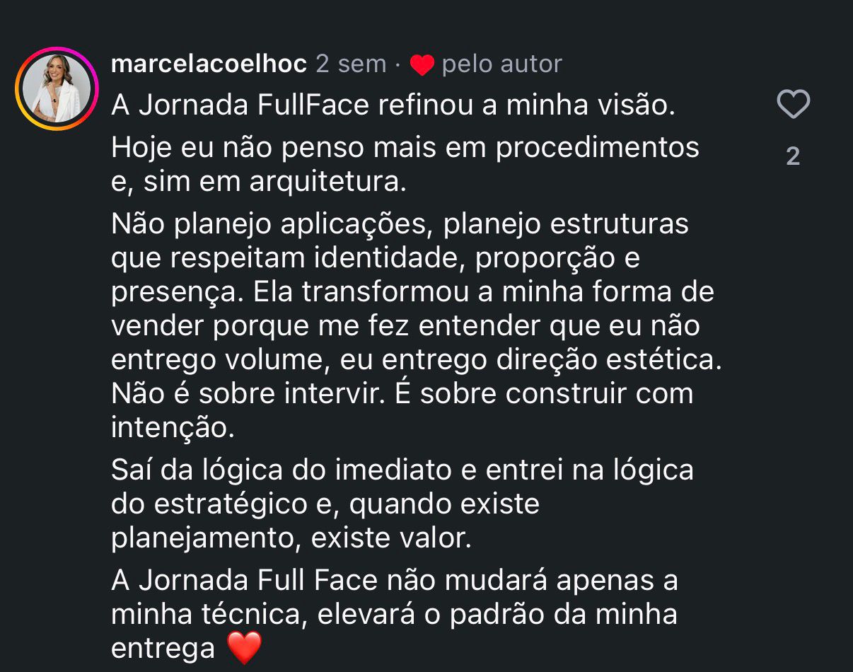 A maioria dos cursos ensina técnica isolada. A Jornada Full Face conecta planejamento clínico, execução ao vivo e estratégia de vendas no consultório — tudo no mesmo dia. Não é mais um curso de técnica. É o elo que falta entre o que você já sabe fazer e o faturamento que você poderia ter.